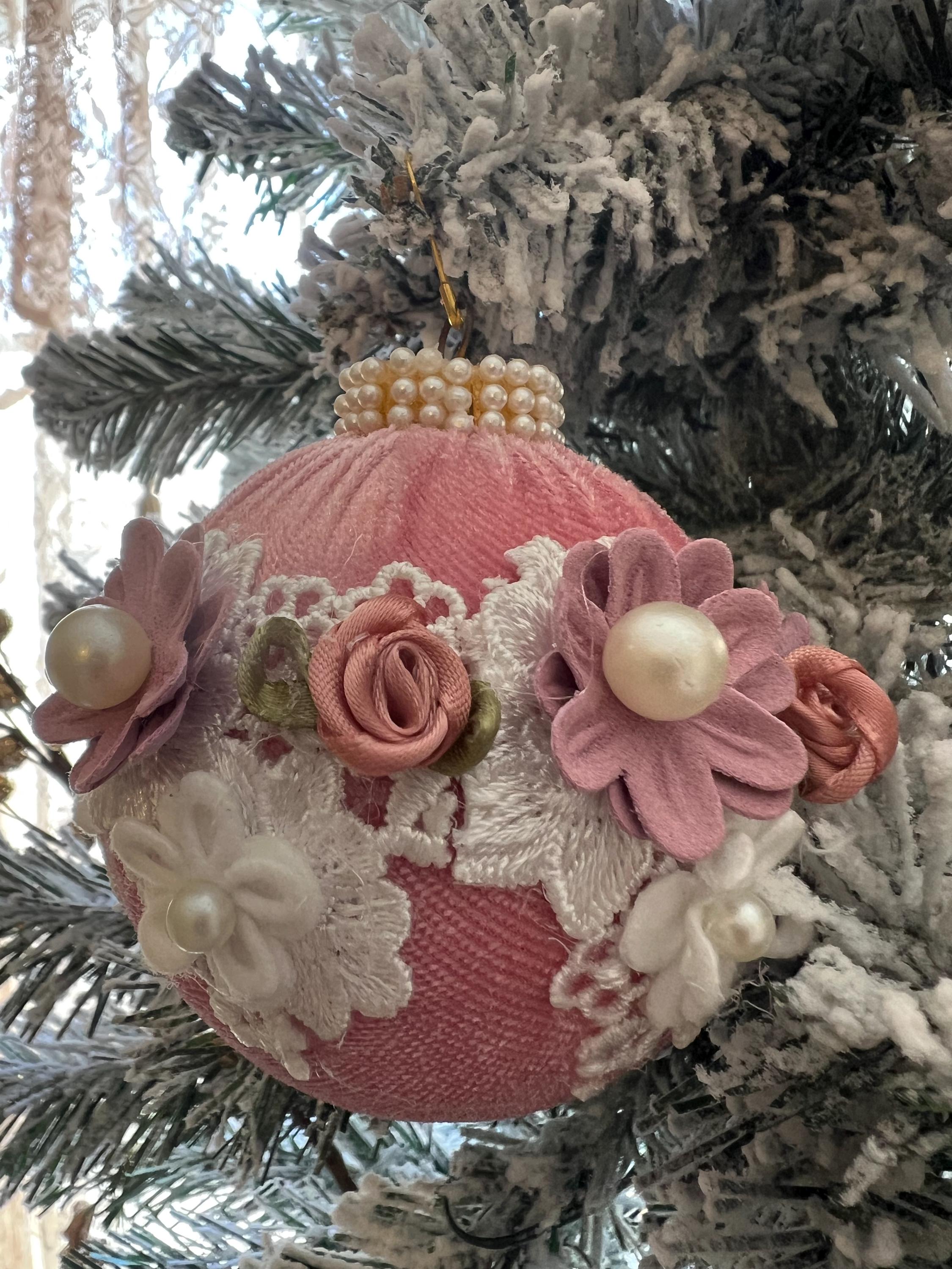 Beautiful Vintage Velvet Victorian-style Christmas ornaments measuring 3 inches. Enjoy your Christmas with these beautifully set of six decorated ornaments featuring Pearls, Flowers, Beads, and Lace Edge Embroidery Trimming. The pink and green mix contains three of each color