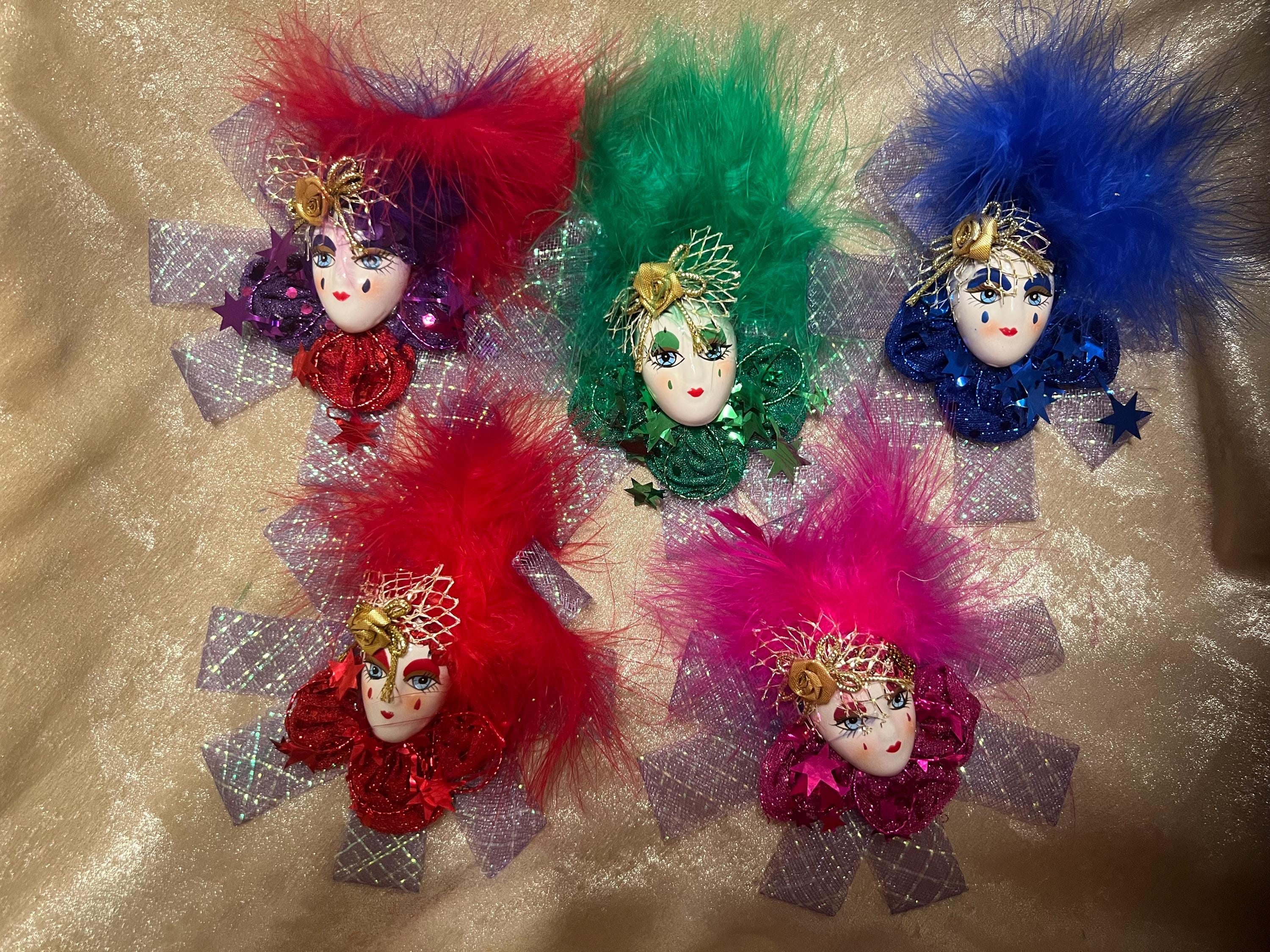 Mardi Gras Mask Face pin brooches with feathers set of five. 6" x 6"